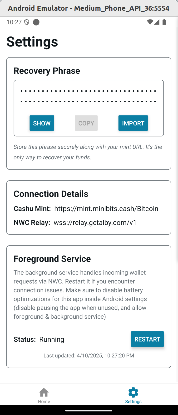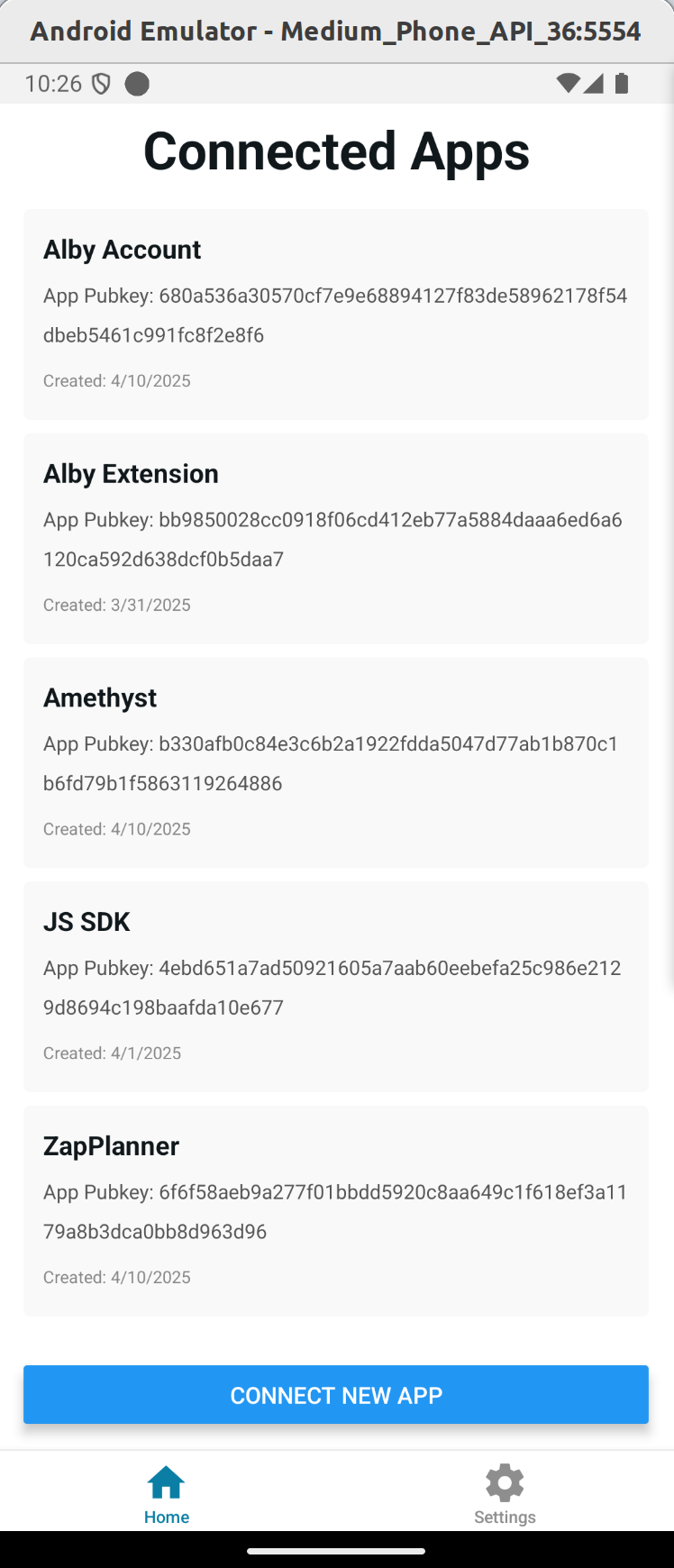 As you see from the screenshots below, unlike a standard mobile wallet, the app has a clear focus on app connections. The app keeps a persistent connection open to the Alby NWC relay, and uses a Cashu wallet, which works quite well as a placeholder for Spark or Ark.