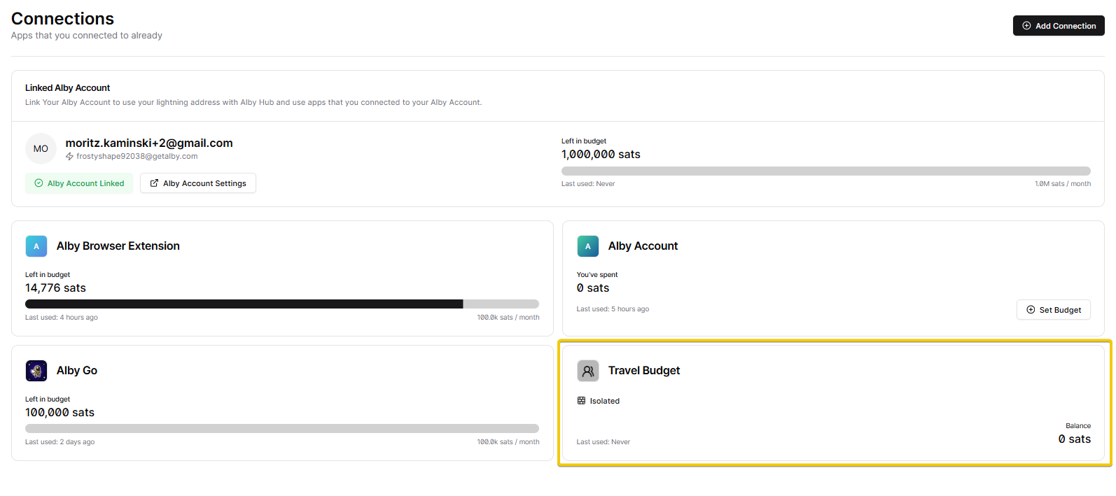 Create monthly budgets in Alby Hub for groceries, travel and many more by using sub-wallets.
