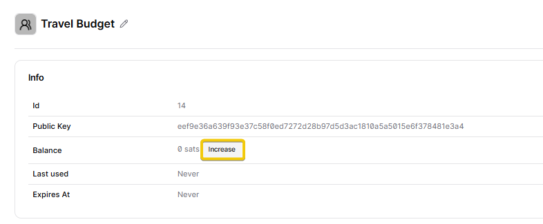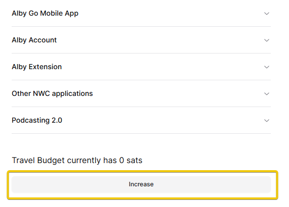 - You can now start allocating an initial budget by clicking "Increase". You can also decide if you want to access this account in another app such as Alby Go, another Alby account or the Alby Extension.