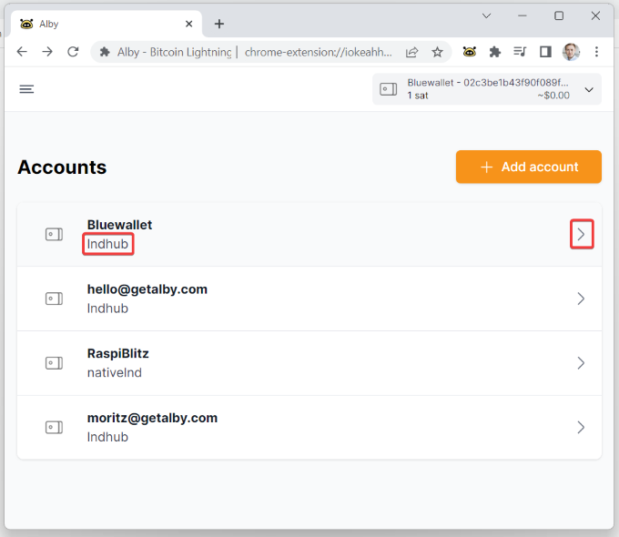 Step 2: Select the account with the 'lndhub' tag by clicking on the arrow symbol