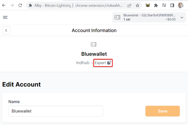 Step 3: Click on 'Export' and check the LNDhub credentials URI