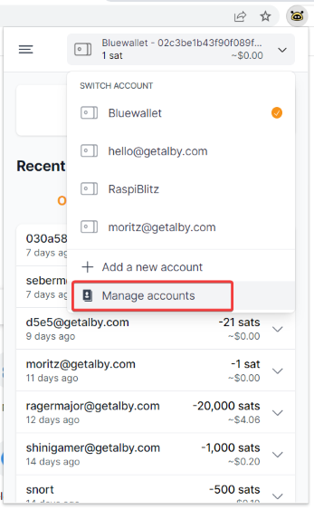 Step 1: Open the Alby browser extension and click on 'Manage Accounts'