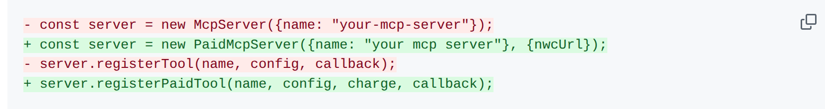 PaidMCP is built on top of @modelcontextprotocol/sdk, The official Typescript SDK for Model Context Protocol. With a few lines of code you can change your free MCP server to a paid MCP server: