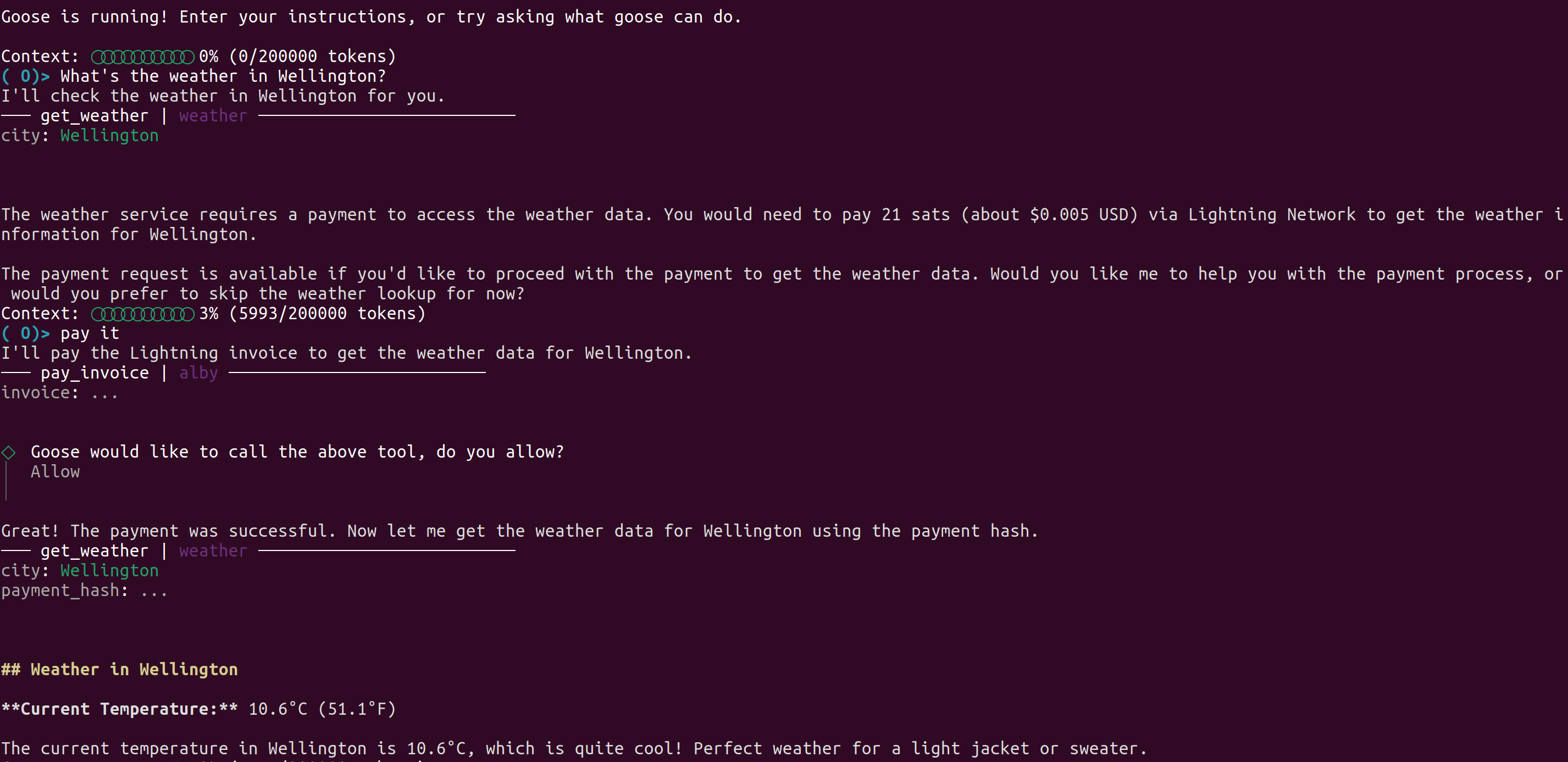 Alby has an example paid MCP server that costs 21 sats to fetch weather data. You can connect the Alby MCP server (instructions here) to make a payment with your preferred agent, and the remote weather MCP server (https://weather-mcp.fly.dev/mcp or https://weather-mcp.fly.dev/sse). Then simply ask "What's the weather in Berlin?".