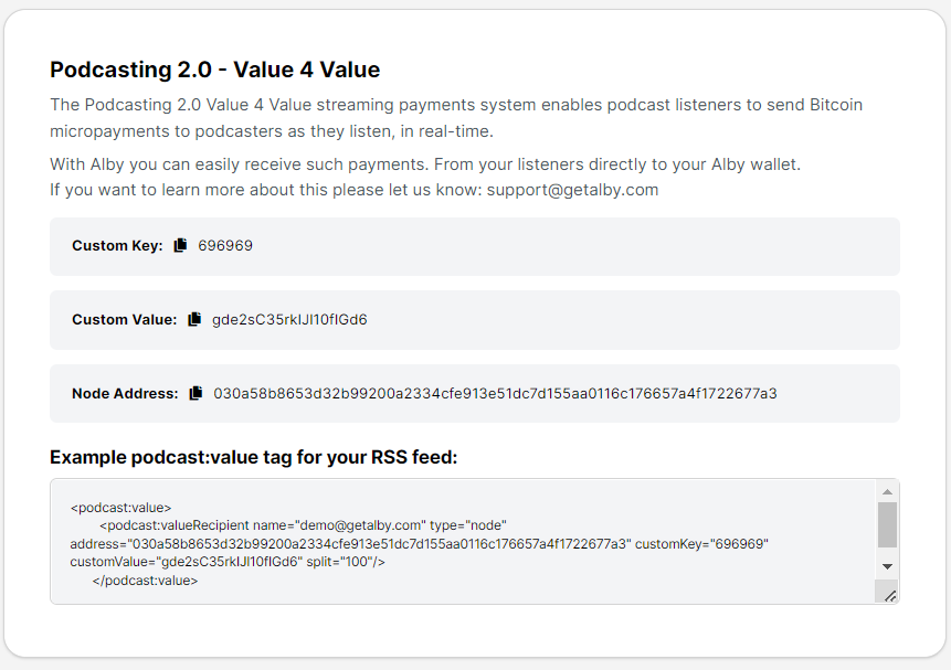 Now you are ready to receive bitcoin directly in your Alby wallet. But don´t forget to tell your listeners to use a podcast player that supports Value 4 Value payments.