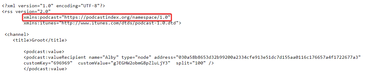 - Add ' xmlns:podcast="https://podcastindex.org/namespace/1.0" ' in the <rss....> line