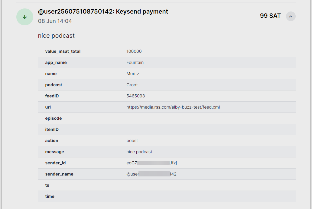 - ts/ time: Timestamp when the boost/stream was sent within the episode