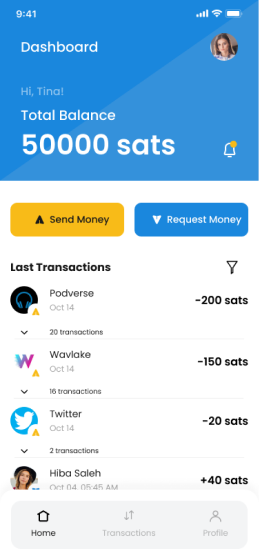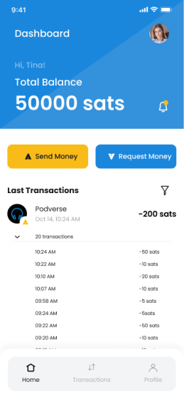 When Tina listens to podcasts from Podverse and decides to stream payments by the minute. Afterward, she scrolls through Twitter and tips every post she finds interesting. Within a short time, the transaction list expands quickly.