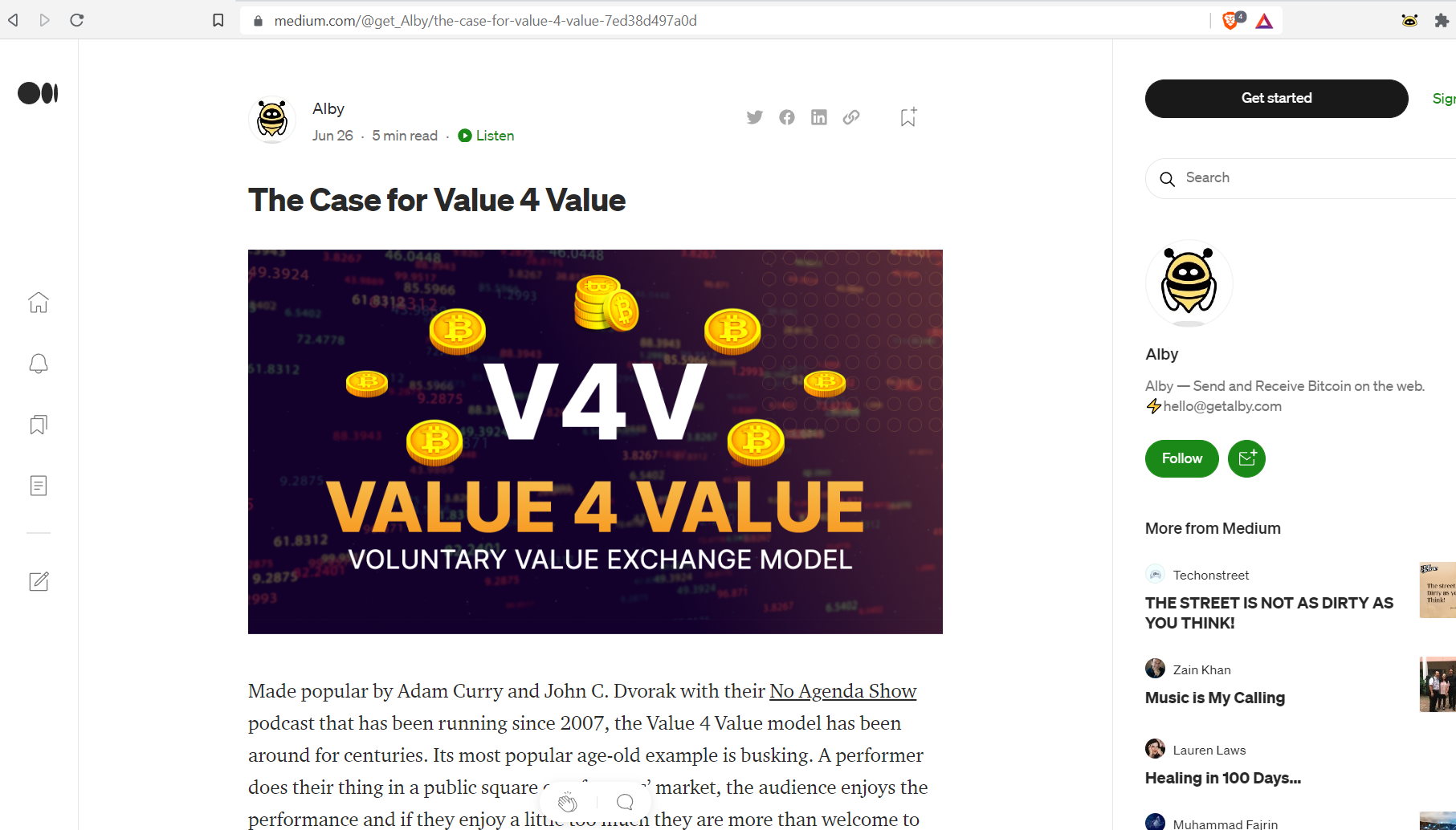 In this article, as part of our Value 4 Value series, we do a quick explainer of how you can send Bitcoin using Alby to a writer on Medium.